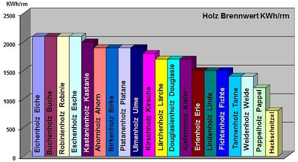 | Holzarten/ Brennstoff | Brennholz Brennwert KWh /rm | Brennholz Brennwert KWh /kg | Zu ersetzende Menge Heizöl / Erdgas in Liter oder m³/rm |